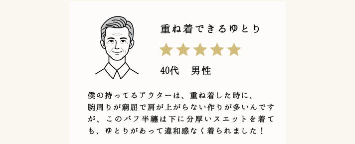 肩周り・腕周りにゆとりを持たせることで、トレーナーやパーカーを重ね着しても、気苦しさのない快適な着心地を実現しました。