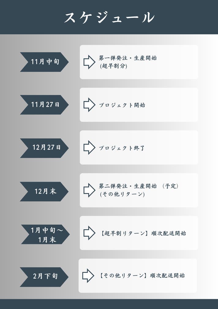 ▼ 必須事項欄(必ず内容をご確認ください)▼ 【配送遅延とキャンセルについて】 本文中に記載させていただいたスケジュールは、あくまでプロジェクト公開時点の予定です。応援購入の性質上、配送遅延のおそれがございます。原則として、配送遅延に伴う応援購入のキャンセルはできませんが、リターン配送予定月から 3ヶ月 を超えた場合には、希望者に限りキャンセルにて対応させていただきます。 【商品等の不具合による返品・交換】 ※「返品交換に関する留意点」を必ずご確認いただき、記入例を参考に記載してください。 ◾️対応条件: ◾️返金額: ◾️返品送料/再送料: 原則として、サポーター都合によるキャンセル・返金は承っておりません。 (サポーター都合のキャンセル不可の例:サイズが合わない、誤注文、長期不在) ◾️対応条件: 商品の初期不良、またはお届けした商品がご注文内容と異なる場合、到着後14日以内にプロジェクトページの「実行者にメッセージ」よりご連絡ください。状況を確認の上、返金対応、または良品との交換対応をさせていただきます。 ◾️返金額: リターン金額(税込)の全額 ◾️返品送料/再送料: 実行者負担 【返品・交換をお受けできない商品】 ・サポーターの責任により破損、汚損が生じた商品 ・商品のタグ、付属品、パッケージ(箱、袋など)を紛失、破棄された商品 ・事前にご連絡をいただいていない商品 ・商品到着後、15日以上経過した商品 【交換をお受けできないケース】 ・限定品や同一商品の在庫がない場合など、代替品をご用意できない商品