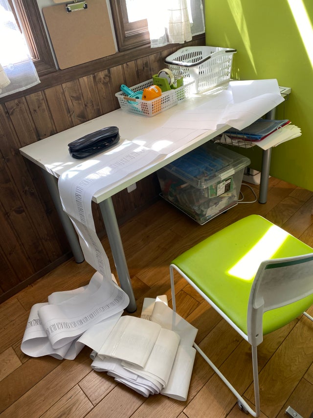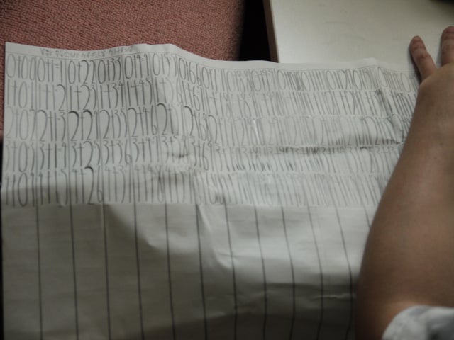 計算式が描かれたB5弱の紙を本人がセロハンテープでつなぎ合わされ、日々成長していきます。