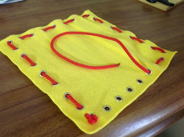 いきなり針と糸を使うと危険なので、まずは安全なフェルトと紐を使い、表・裏と順番に通していく仕組みの練習をします。