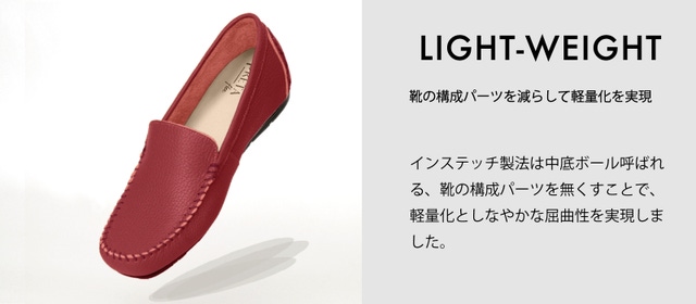 - 革靴よりカジュアルでスニーカーほどくだけすぎないデザイン性、約250gの軽さ、柔らかさ