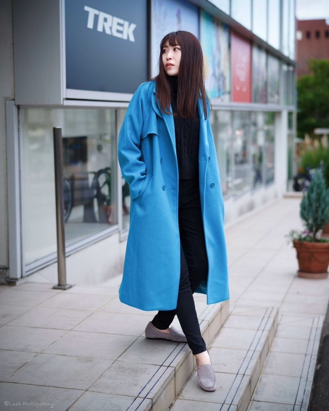 ※モデルの清水 碧様 スエードグレーを鮮やかなブルーのコートで素敵にコーディネートしてくださいました。