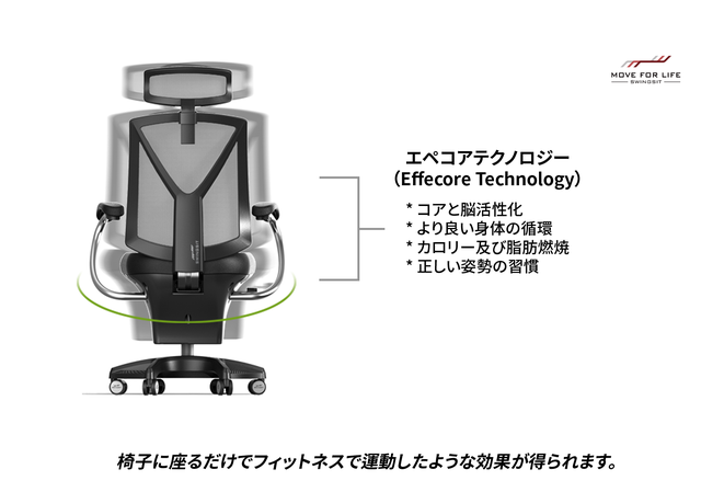 A : セガンASCで独自に開発した技術です。 無電動無電力で,まるでぶらんこに乗るように、長い時間椅子に座って生活する人がより軽くなり、快適で活力がある健康になる重要な技術です。 エペコア(EFECORE)技術は、カロリーや脂肪燃焼も可能です。つまり、座っている間フィットネスと動きを 楽しめることができる技術です。