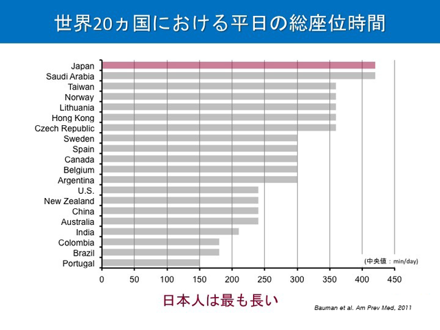 シドニー大学の研究者たちが世界20カ国の成人を対象に、平日に座っている時間について調査した結果、日本人が最長で1日420分=7時間でした。20カ国中で、もっとも長い時間でした。