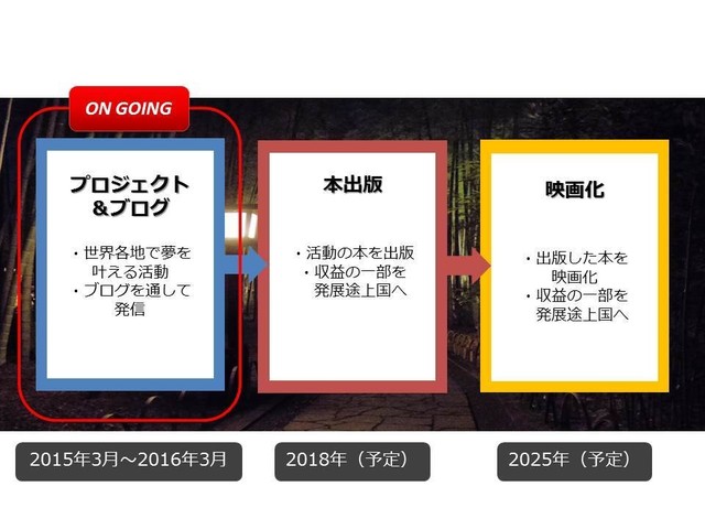今までの活動の中で映画や本の影響も強く受けました。このプロジェクトは、自分の経験を本にし、それが映画化され、一人でも多くの学生が何か行動するキッカケになることがゴールとなっています。