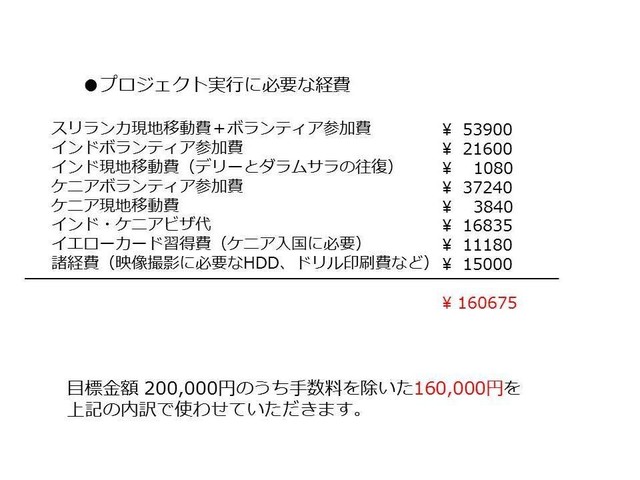 目標金額を20万円に設定し、Makuakeへの手数料(15%)、クレジットカード手数料(5%)を除いた16万円を上記の内訳で使わせていただきます。