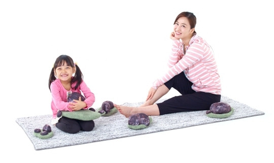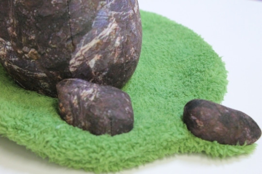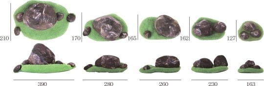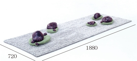 計15個(5群)からなるレイアウト自由な石クッション。素材はポリエステル100%で石はサラリとした手触り、草部分は毛足の短い柔かな手触りです。石部分はラグに接着されていないため、単体でクッションとしてお楽しみ頂けます。一番良い高さの石を見つけて枕代わりとしてもお使いください。
