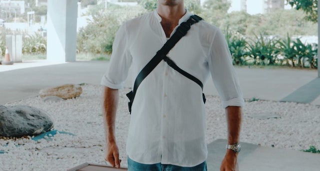 - コンパクトでエキスパンダブル(拡張可能)なスリングバッグ。拡げれば一眼レフカメラも入る