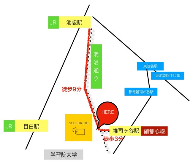 ※エクセルで作成したので手作り感ある地図で恐縮ですが、明治通り沿いなので人通りが多く、道も大変分かりやすいです!