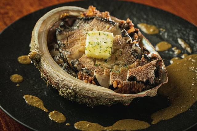 そのあわびに、ガーリックとバターで作るソースをたっぷりとかけ、プリプリとした独特の食感を存分に楽しんでいただきます。