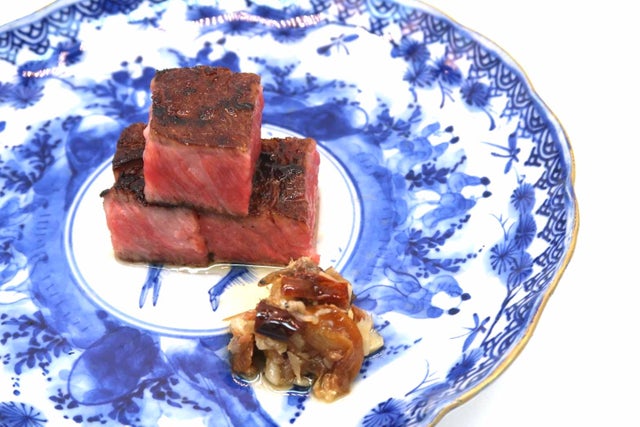 「日向備長炭で焼き上げた宮崎牛のサーロインチャーシュー 宮崎食材のXO醤、MY醤油添え」