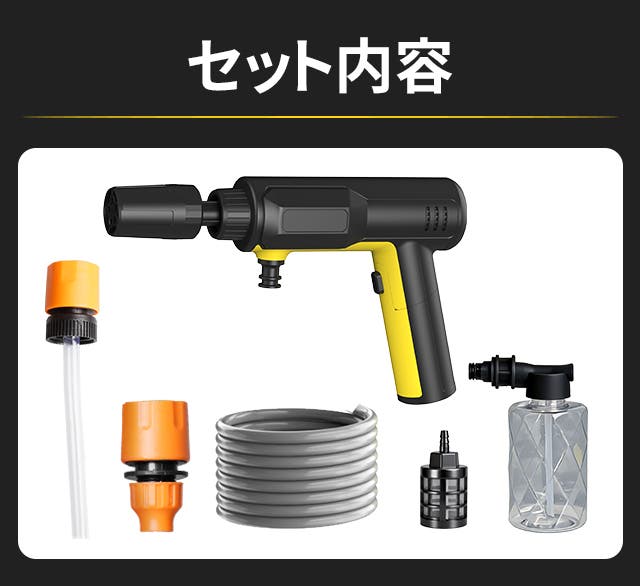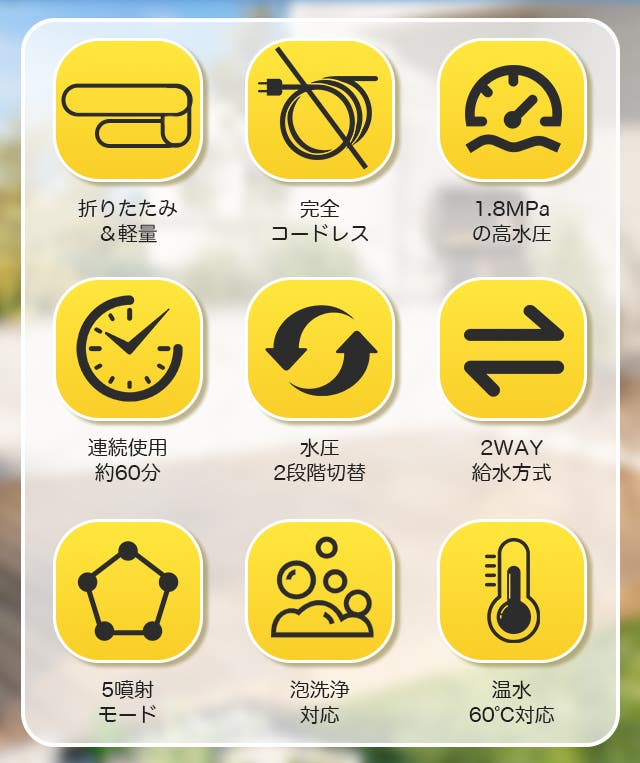 ホースに縛られず、どこでも自由に使えます。アウトドアや駐車場など、場所を選ばず活躍します。