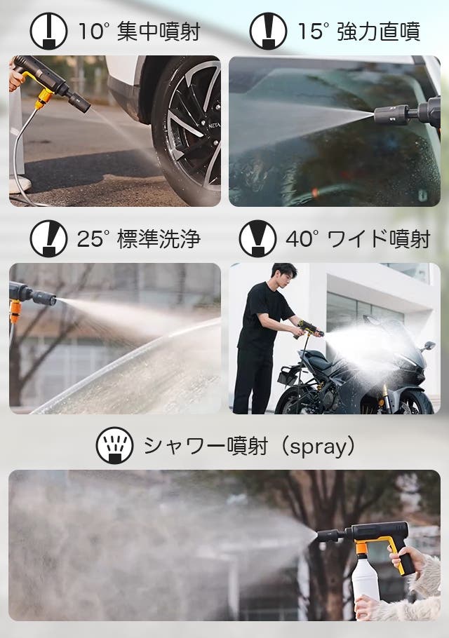 泡立てて洗浄できるスプレー機能で、車体全体を手軽にカバー。