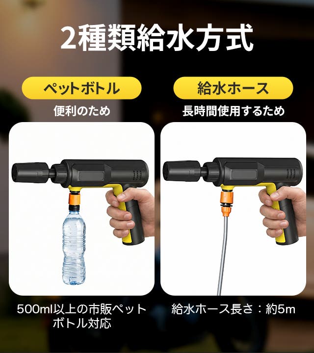 たっぷり使いたい時は、付属の5m給水ホースで連続使用も可能。