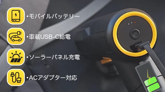モバイルバッテリーや車載USB-C、ソーラーパネル、ACアダプターなど、さまざまな方法で充電可能。