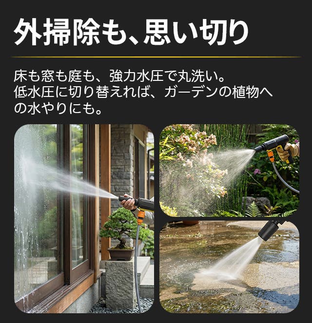 強力な水流で汚れを素早く落とし、広い範囲も効率的に洗浄可能です。