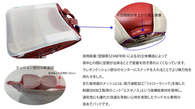 ランドセルと背中に空間を作るという実用新案登録(登録第3234878号)の3D立体構造が背中の蒸れとランドセルの重みを軽減させます。