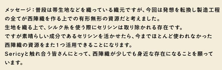 ブランド名には、素材である Sericin(セリシン) と、循環を意味する Cycle(サイクル) の思いを込めています。