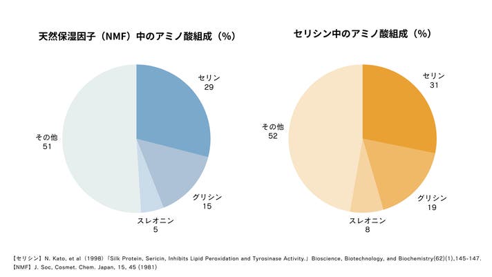 セリシンが「天然の保湿成分」と呼ばれる理由は、そのアミノ酸のバランスにあります。セリシンはタンパク質で構成される成分で、そのアミノ酸組成は、人の皮膚が本来持つ天然保湿因子(NMF)の組成と非常に近いことがわかっています。特に極性アミノ酸の一種であるセリンが約29%と最も多く含まれており、このセリンが肌の水分と油分のバランスを整え、しっとり感をあたえます。