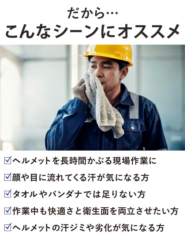 - ヘルメットの中でしたたる汗に!わずらわしい汗ふきの回数を減らし、作業に快適に集中できます