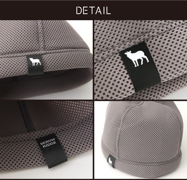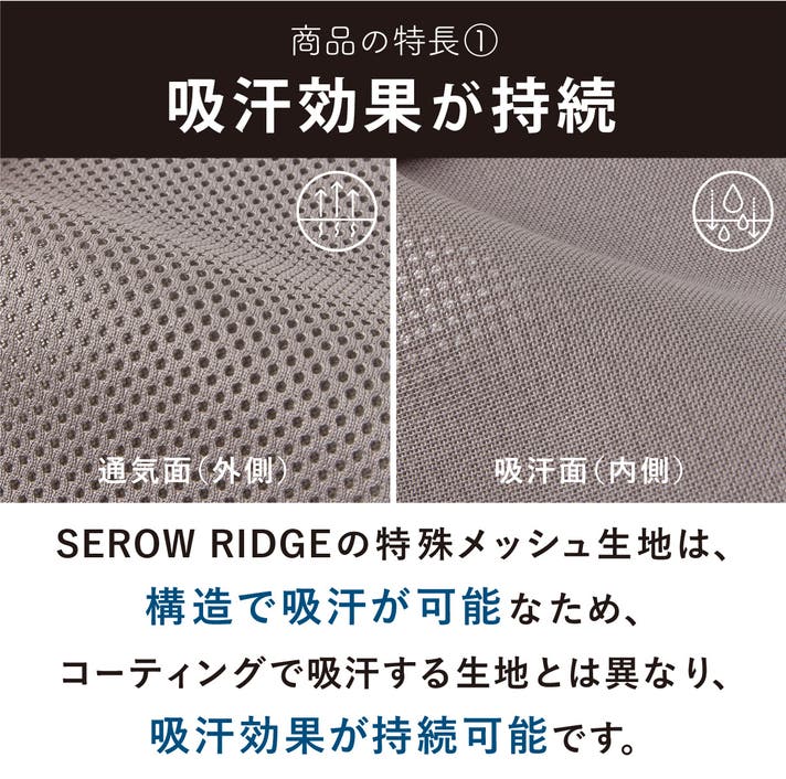 SEROW RIDGE の特殊メッシュ生地は表面と裏面が異なる縫製でつくられており、肌に当たる内側の面はきめ細かい生地になっており、汗を吸いやすく、外側の面は大きめメッシュで通気性の高いつくりになっています。