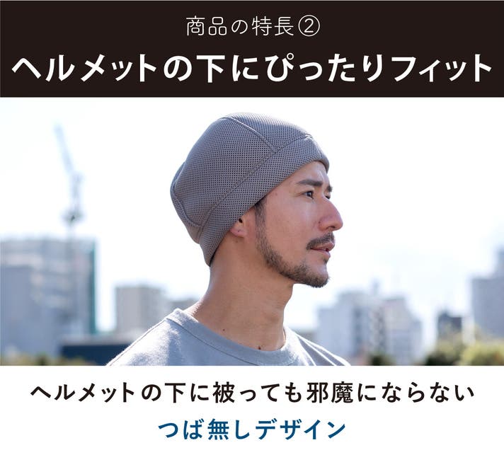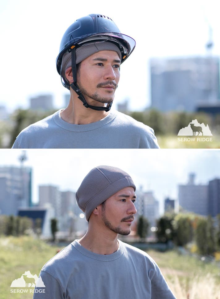 ビーニーのようなシルエットで、ヘルメットを脱いだ後の髪型の乱れも抑えてくれ、そのまま被っていてもオシャレなデザインです。タオルやバンダナのように巻きつける手間や、巻きなおしが必要ないこともポイントです。