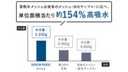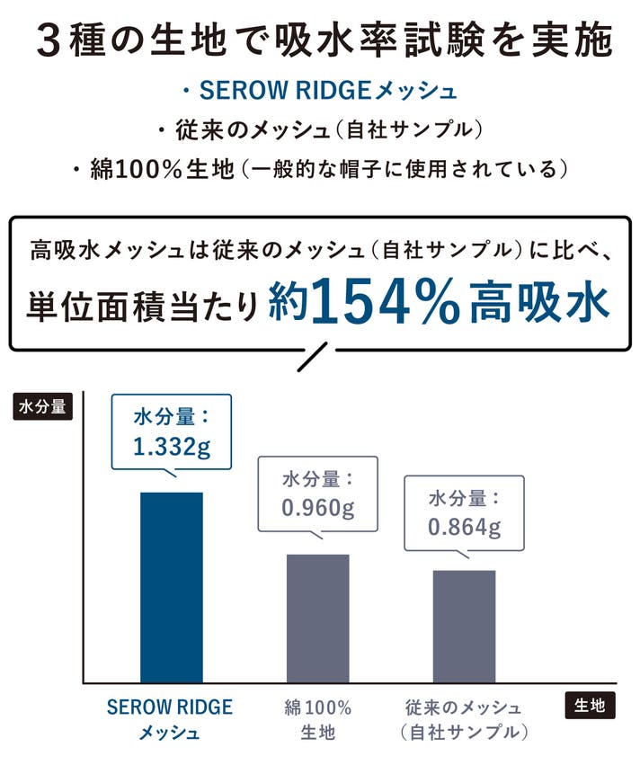 同じ面積当たりで吸水した水の量と比較して、「SEROW RIDGEメッシュ」は「通常メッシュ」に比べ、単位面積当たり約154 % 高吸水、「綿100% 生地」 と比較しても約138 % も高吸水という結果が出ました。