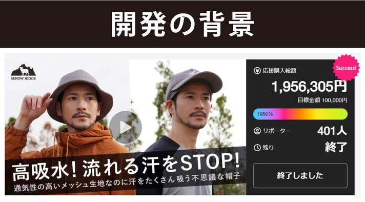 以前、当社がクラウドファンディングで販売した「高吸水メッシュキャップ・メッシュハット」。こちらの商品は、『暑さの厳しい低山の登山でいつも汗だくになり、下山する頃には顔をタオルで拭きすぎて肌荒れを起こしてしまう・・』という多汗の悩みから誕生した商品で、400人を超える方から応援をいただきました。