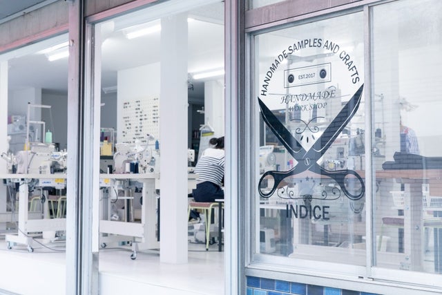 看板には前の家主だった精肉店の文字がそのまま。東京の片隅のあばら屋へ、岡山からミシンとセルヴィッチデニム生地を運び込み、デニムの聖地と世界のメゾンからも評価される岡山のクラフトマンシップそのままの工場を作りました。