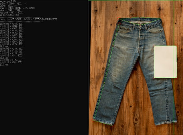 今回テストを行うシステムは、お気に入りデニムとA4用紙を並べて写真を撮ることにより、自動採寸が行われ、ジーンズを作るための設計図がおこせるというもの。