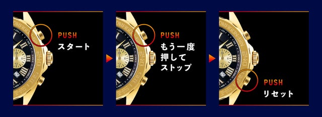2時位置のプッシュボタンを押すことで、クロノグラフ針がスタート。クロノグラフ針は、60秒で文字盤上を1周します。