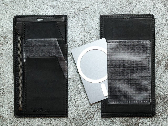 - ハイブランド御用達のカーフレザー×軽量・高強度・極薄のダイニーマを使用。超軽量&薄型化を実現。