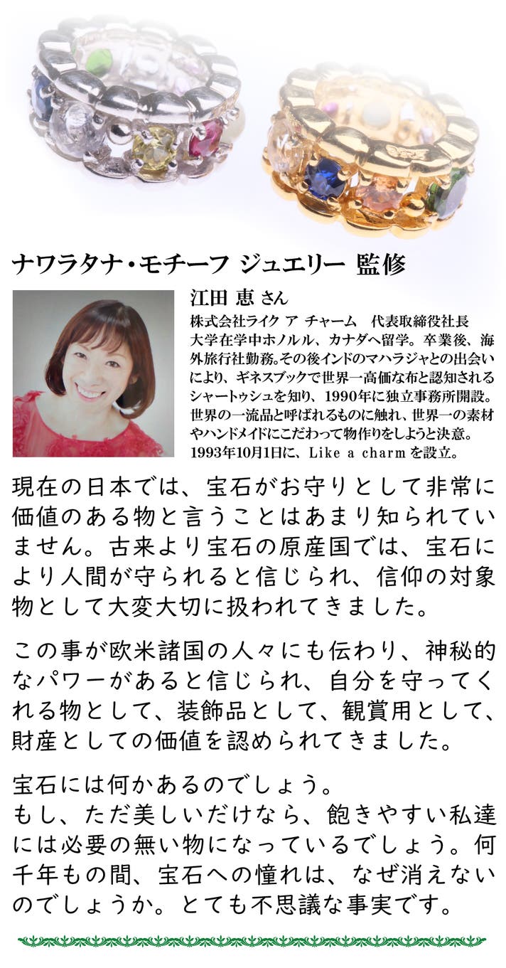 江田 恵さんは、2000年にスリランカの方から、9つの宝石を使ったジュエリーを受け取りました。その後、9つの宝石を使用したジュエリーに、お守りとしての歴史があることを知り、深く興味を持ったそうです。江田さんは、実際にスリランカに渡り、沢山の調査、研究をして、オリジナルのナワラタナ・ジュエリーを完成させました。
