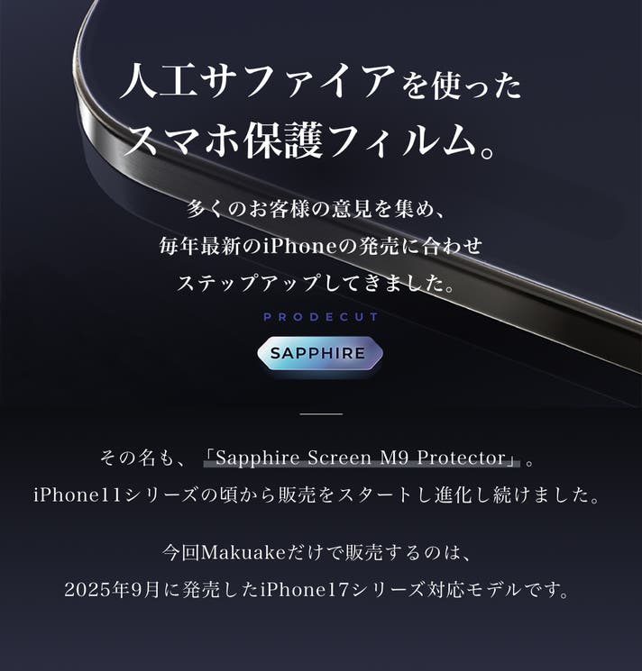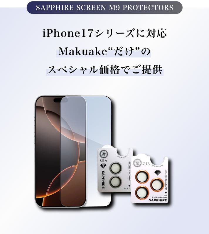 「Makuake(マクアケ)」は、実行者の想いを応援購入によって実現するアタラシイものやサービスのプラットフォームです。このページは、 プロダクトカテゴリの 「ダイヤモンドの次に硬いモース硬度9人工サファイヤのiPhone17用フィルム」プロジェクト詳細ページです。