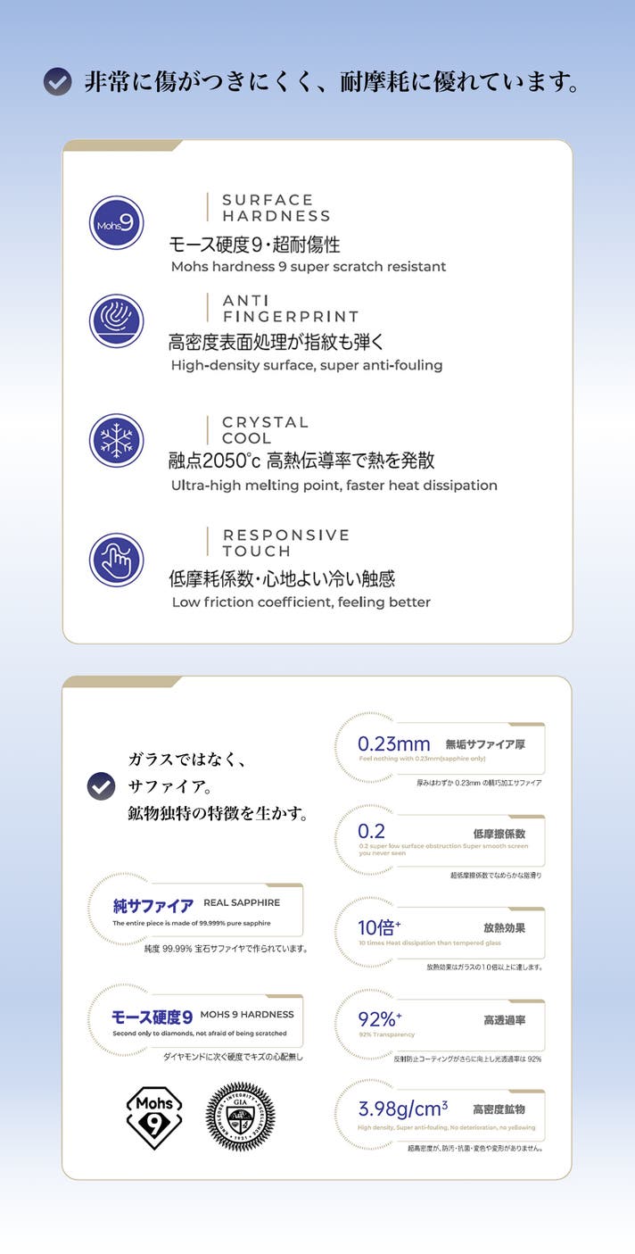 精密な技術を使って、厚さ0.23mmを実現しているため、操作性や反応速度に支障はありま せん。タッチ感もサファイアの特性により、非常に滑らかで若干の冷感があります。