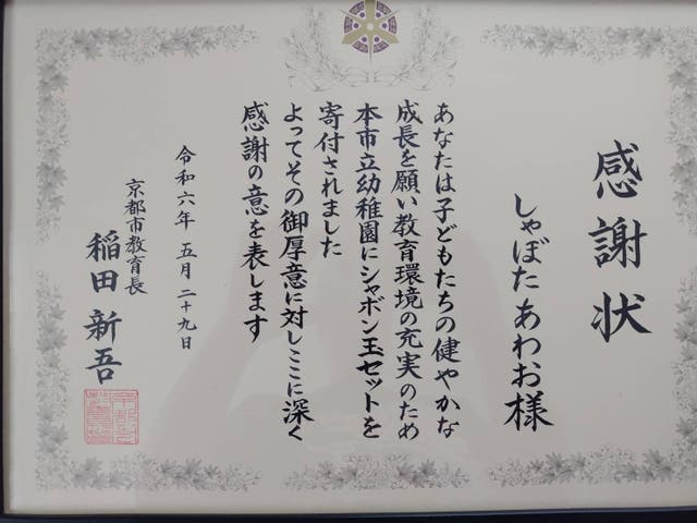 しゃぼたあわおが考案したシャボン玉グッズを市立幼稚園15園に寄付をさせていただき、
