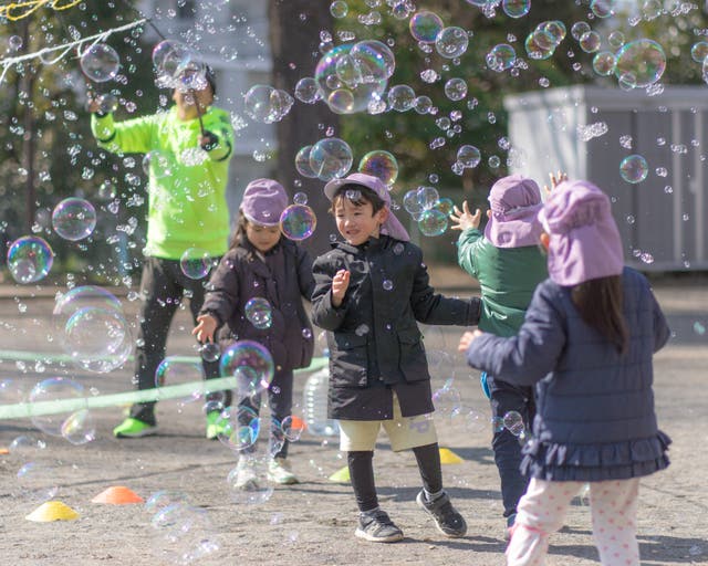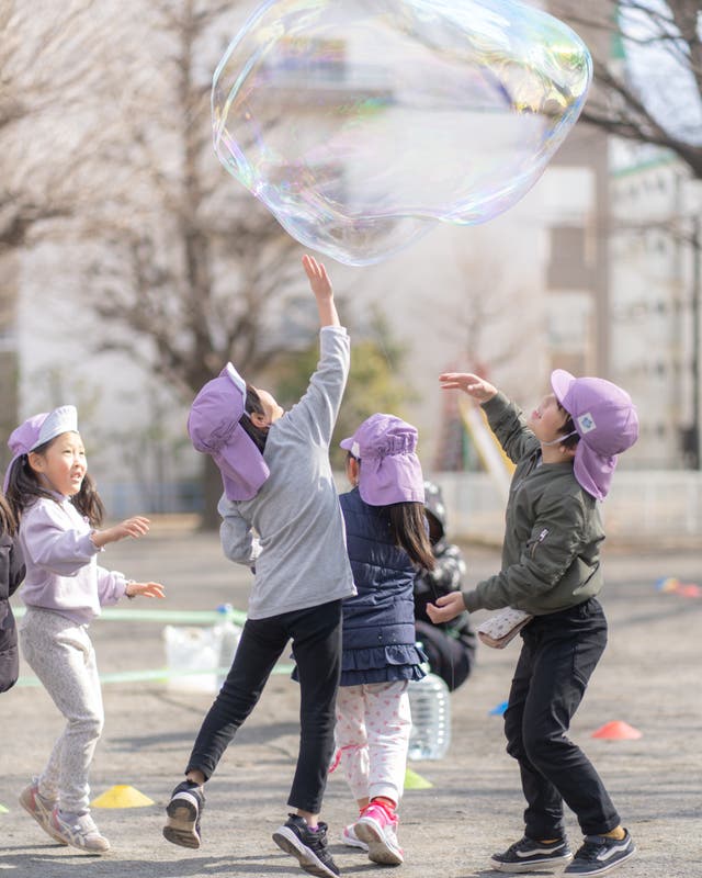 園児たちは大小たくさんのシャボン玉に夢中で、追いかけたり、割ったり、触ったりしてシャボン玉遊びに夢中でした。