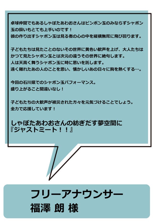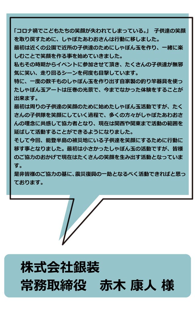 今回、この応援プロジェクトの応援金で、石川県内の被災地でシャボン玉イベントをさせていただけないでしょうか?