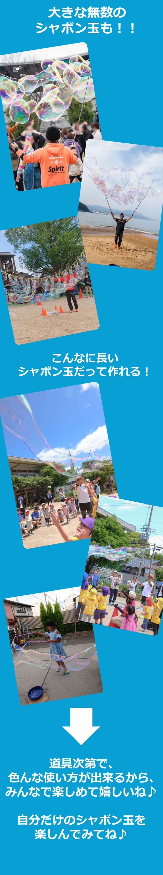 園の中には隣の家が全壊しているところもあり、地震の怖さを痛感し、今回は3園でのシャボン玉でしたが、第二回、第三回と続けてシャボン玉を届けて、微力ではございますが、被災地のお力になりたいと思いました。