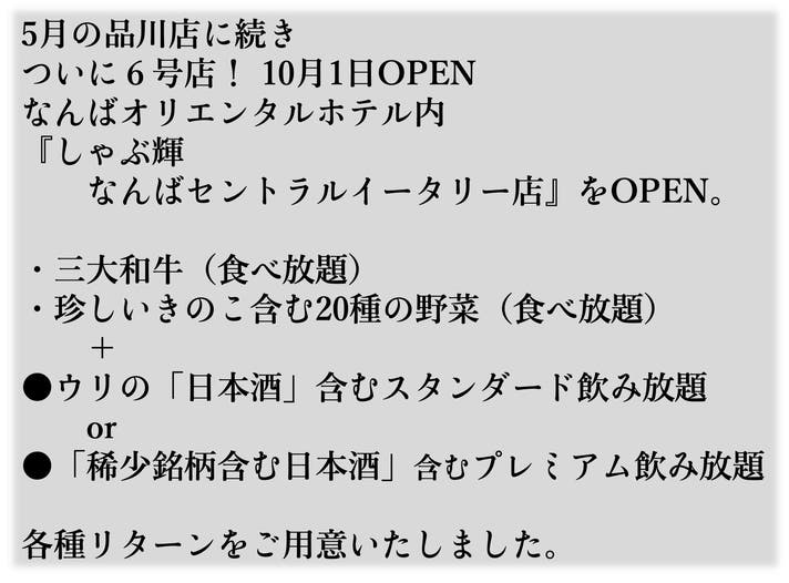 - 【6号店OPEN|なんばオリエンタルホテル2F】銀座が本店の『しゃぶ輝』が関西に初陣を迎える