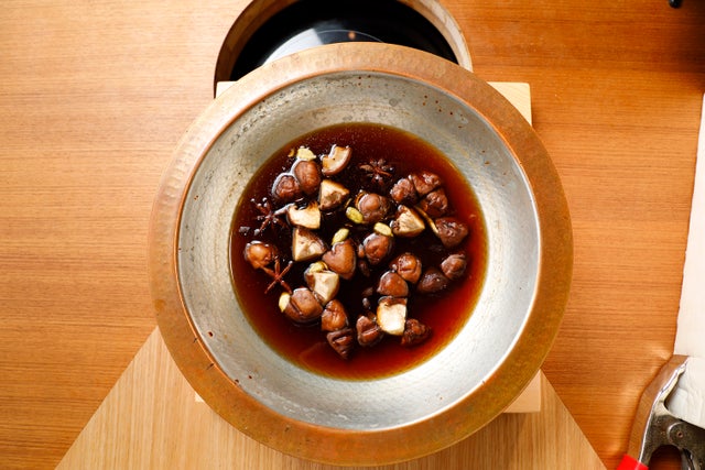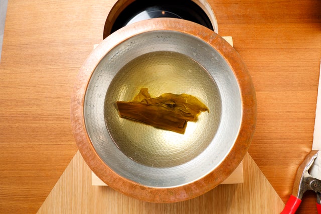 まず召し上がっていただきたいのはメインスープとしてご提供する「羅臼昆布と鰹の黄金だし」。自家発酵熟成豚の旨味を最大限に感じられる至極のスープです。