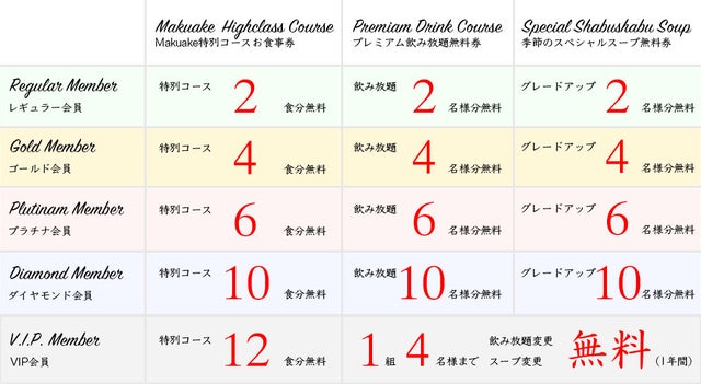 会員だけの様々な特典とMakuake特別コース6食分とプレミアム飲み放題変更券6回分、スペシャルスープ変更券6回分が付くプランです。