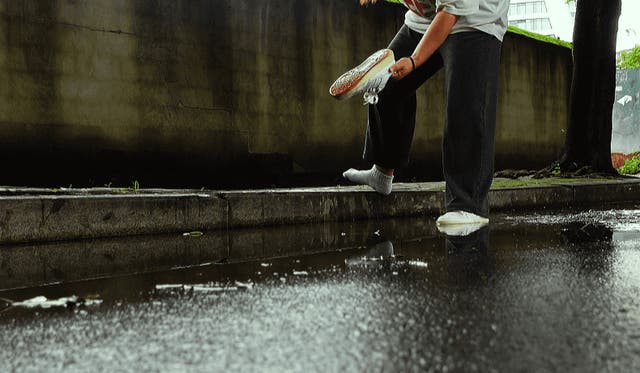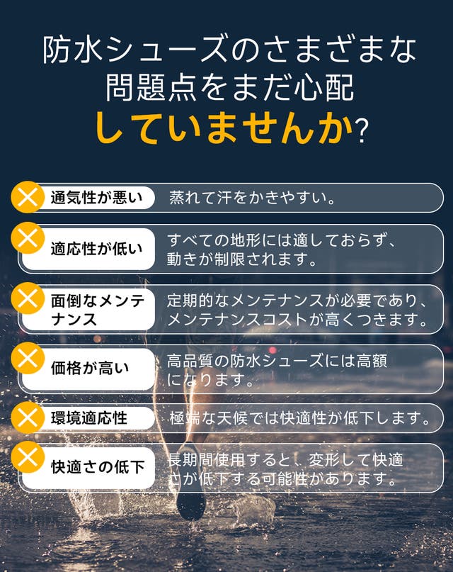 変わりやすい天候:雨の日には防水機能で足元をしっかり守り、そして、足が蒸れずに快適に保たれます。