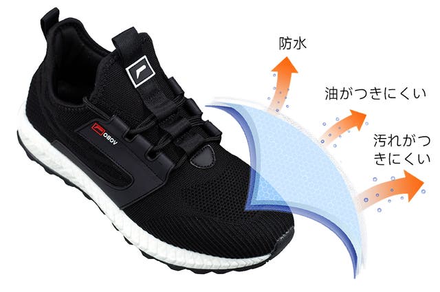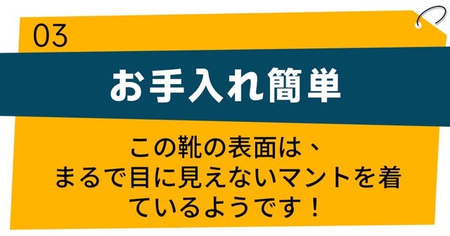汚れや油がつきにくく、お手入れが簡単なのも嬉しいポイント!ナノコーティング技術により目に見えない保護膜を形成し、汚れや油汚れの付着を防ぎ、靴を清潔に保ちます。