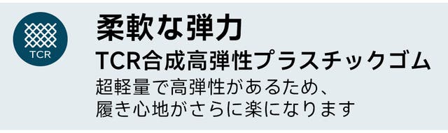 ソールには高弾性の可塑化ゴムを融合したTCR(サーモプラスチックコントロールラバー)を使用しており、経年劣化や耐摩耗性に優れ、発泡EVAの超軽量・高弾性の特性を併せ持ち、快適な履き心地を実現しています。