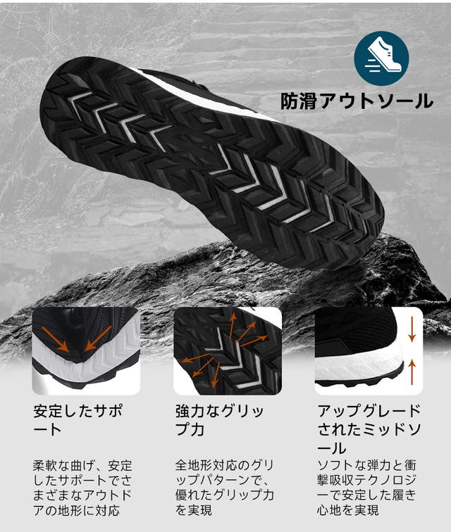 ソールは、さまざまな地面状況に最適な歩き心地と長期的な耐久性を提供するように設計されており、アウトドアアドベンチャーでも街歩きでもに快適な体験を提供します。