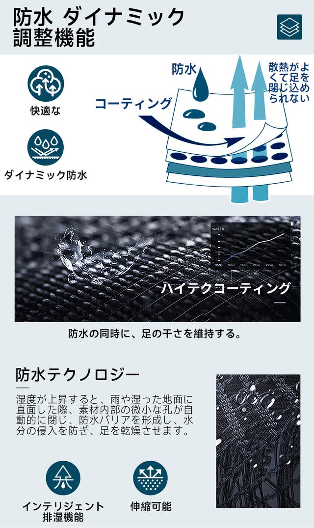 この革新的な防水シューズは、独自のスマート調整テクノロジーにより従来のフットウェアの限界を打ち破り、様々な天候でも足を快適でドライに保ちます。防水性とムレにくさの動的なバランスを巧みに組み合わせ、足に前例のない適応性を体験させます。