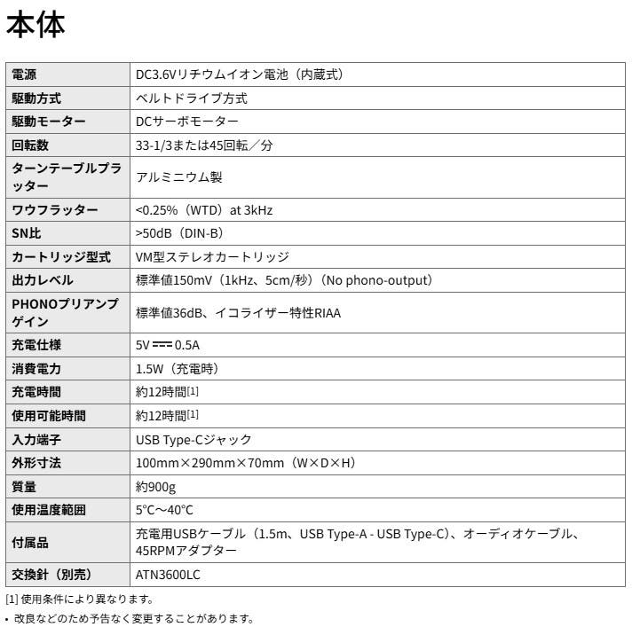充電用USBケーブル(1.5m、USB Type-A / USB Type-C)、オーディオケーブル、45RPMアダプター(本体に付属)