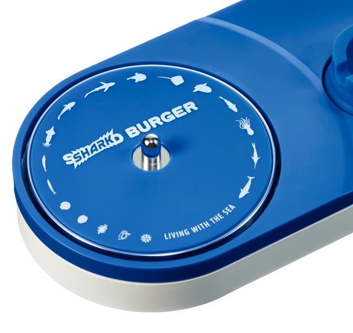 今回のSHARK BURGERでは、その仕組みを“見える形”で伝えるため、製品背面に金属プレートを取り付けました。このプレートには、使用しているヨシキリザメ(Blue shark)が漁獲された三陸沖の海域を示す代表座標と品種名を印字しています。