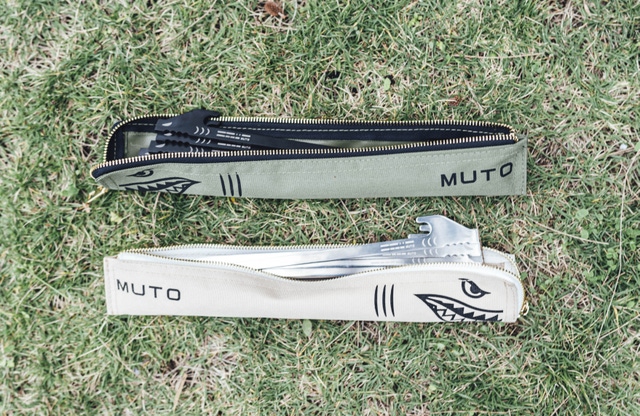 Shark Pegには、ペグ8本をスリムに収めることのできる収納ケースがついています。ペグの先端で破れたりすることのないよう、ケースには厚めの生地を使用。ブラックはオリーブ色、シルバーはアイボリー色の、高級感のある専用の袋に入れてShark Pegを持ち運びいただけます。
